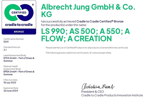 JUNG德国永诺成为全球首家获得拥有Cradle to Cradle Certified®认证("从摇篮到摇篮®"循环经济认证,以下简称“C2C”)的KNX 产品的制造商。